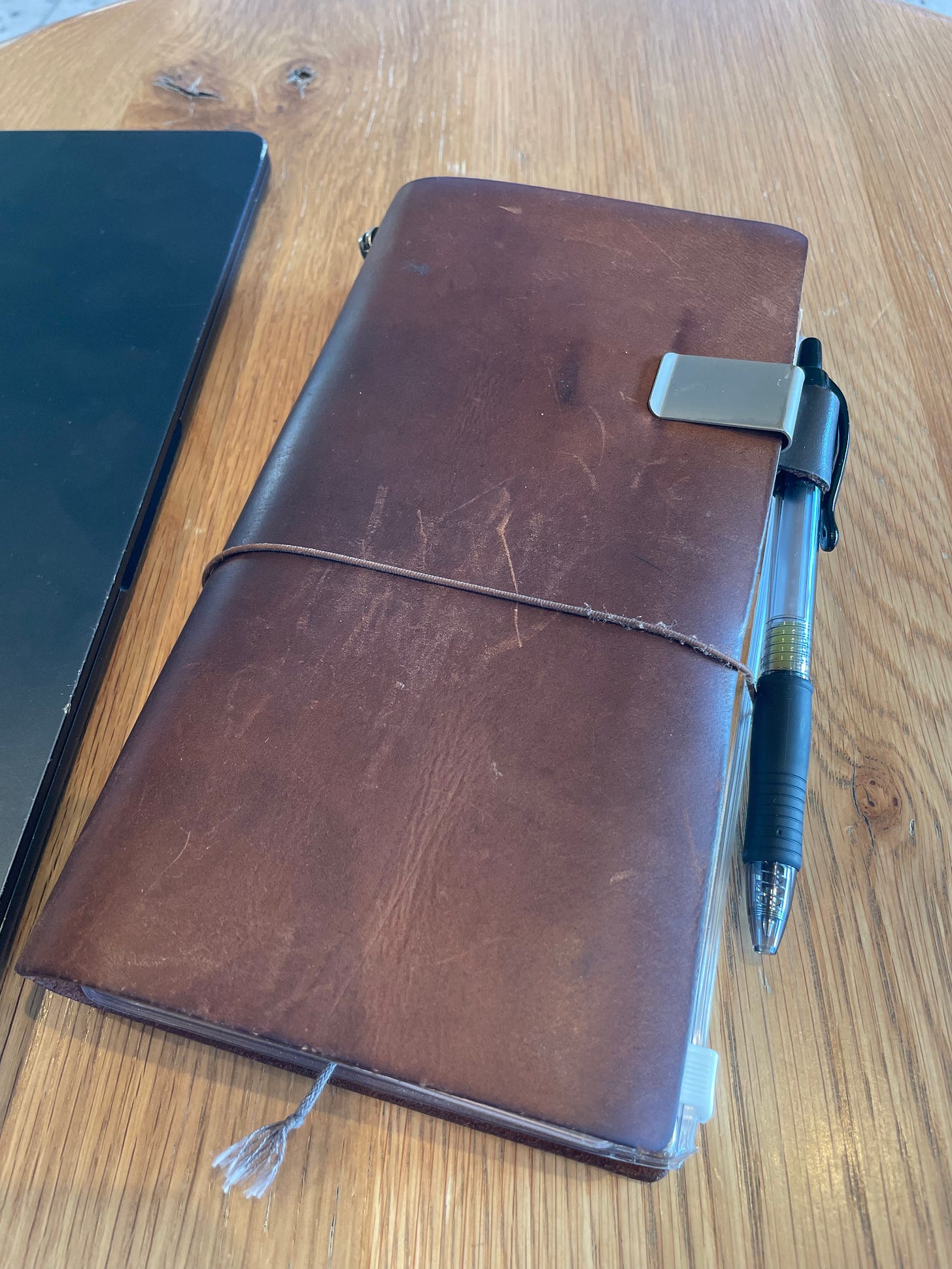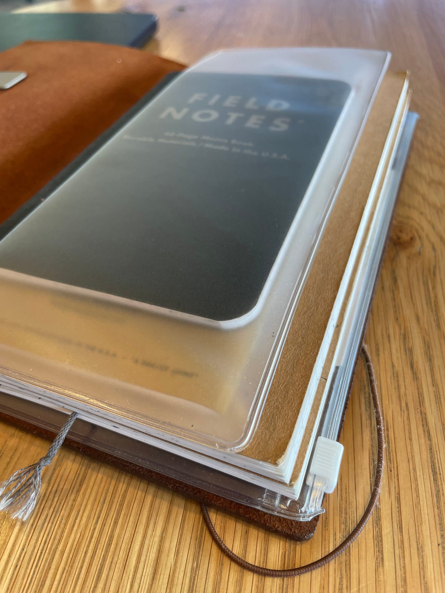 The Traveler's Notebooks have been my daily notebooks for the past two years, and I love them. I have a leather cover with a clear plastic pouch and two notebook inserts at a time. Not only can I replace the notebook inserts once they’re full, I can also carry around a few Field Notes notebooks in the pouch. And I always have a pen attached.
